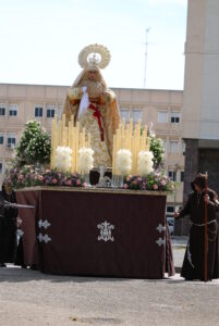 Desde 2019, procesiona en una carroza nueva, realizada por un grupo reducido de hermanos de la Cofradía. Greca de madera plateada y candelería bañada en plata mate. Sus medidas son de 3×2 m.